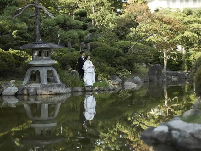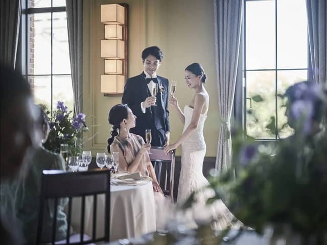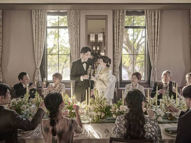 窓から天守閣を一望できる会場で、ホテルのスイートルームのような上質な空間と、ゲストとの距離が近い和やかなウェディングのひとときを。
