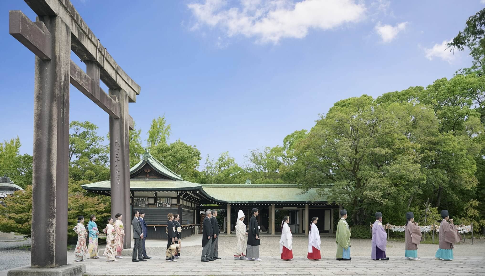 心地よい風が通り抜ける境内を参進する花嫁行列に緊張感が高まる。