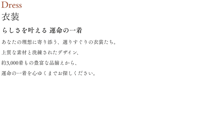 伝統の中にもモダンスタイルをプラスし、和装を美しく 着こなすためのスタイリングをご提案。また海外のインポートドレスも多数ご用意し、ドレス展示しております。