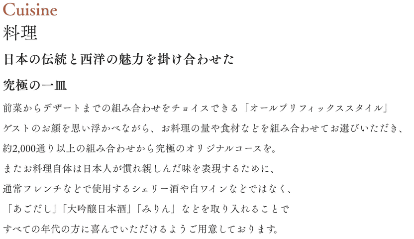 ミシュラン星獲得シェフが創り上げる至極のフルコース。50種類以上の食材を使った彩り豊かなお料理はゲストの満足度が高い逸品。